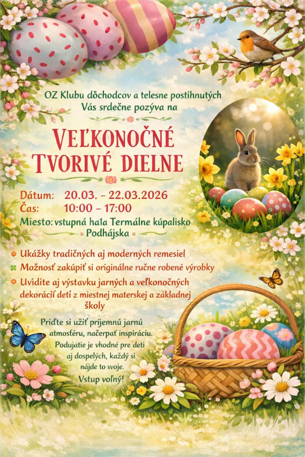 Nenechajte si ujsť jedinečné podujatie s veľkonočnou atmosférou a navštívte Veľkonočné tvorivé dielne vo vstupnej hale Termálneho kúpaliska Podhájska. Vstup voľný. Tešíme sa na Vašu návštevu.