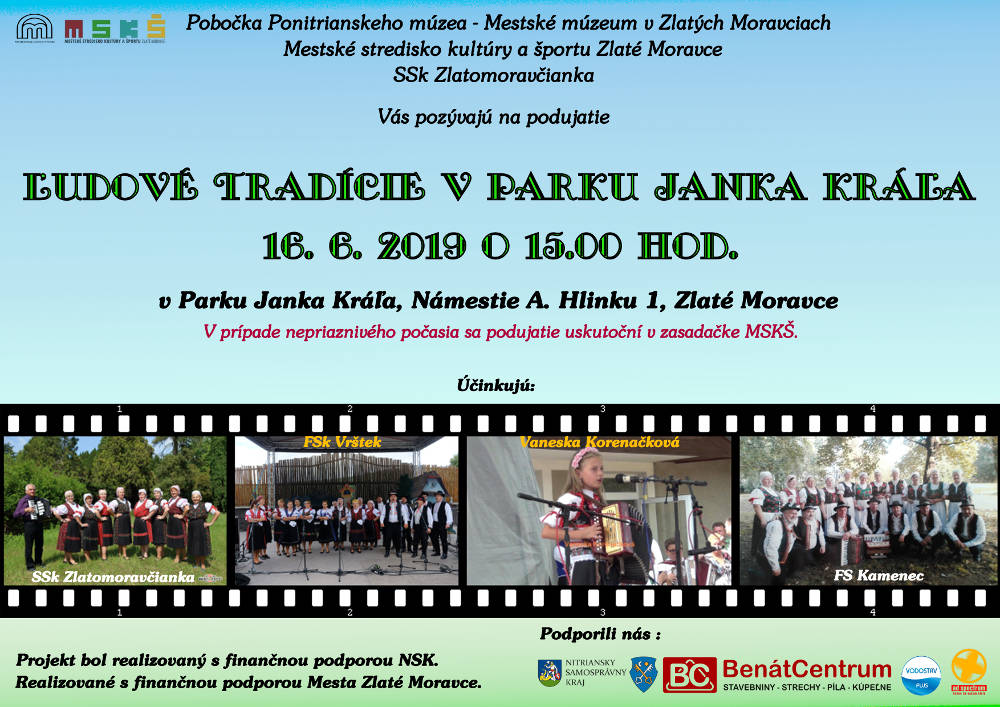 Preneste sa s nami do minulosti pálenia jánskych ohňov s FSk Vrštek a pečenia chleba s FS Kamenec na podujatí Ľudové tradície v Parku Janka Kráľa, ktoré sa uskutoční 16.6.2019 o 15.00 hod. na Námestí A. Hlinku č. 1 v Zlatých Moravciach (v Parku Janka Kráľa). Atmosféru dotvorí mladá talentovaná speváčka hrajúca na heligónke Vanesa Korenačková a SSk Zlatomoravčianka spievaním ľudových piesní. Vstup je voľný. Projekt je realizovaný s finančnou podporou NSK a Mesta Zlaté Moravce.