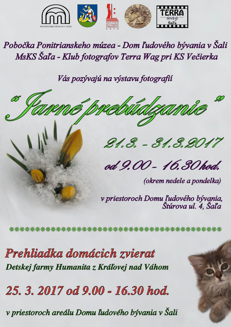 Približne 40 fotografií zachytávajúcich pocity a dojmy členov Klubu fotografov Terra Wag pri KS Večierka z potuliek na Slovensku ponúkne nezabudnuteľný pohľad na rôzne historické budovy (hrady, zámky), parky, prírodné krásy ale aj modernu Slovenska. Výstava Krásne Slovensko, bude otvorená od 16.3. – 27.3.2020 v priestoroch Domu ľudového bývania v Šali, v pondelok – piatok, v čase od 9.00 – 17.00 hod. V sobotu a nedeľu bude zatvorené.