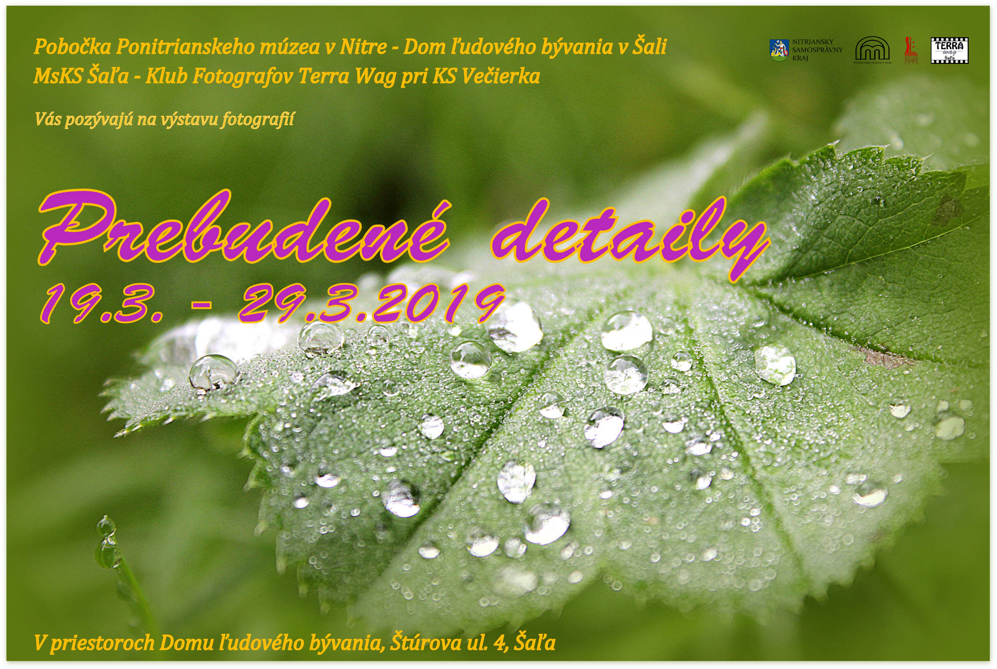 Členovia Klubu fotografov Terra Wag pri KS Večierka predstavia na výstave Prebudené detaily, ktorá bude otvorená od 19.3. – 29.3.2019 v priestoroch Domu ľudového bývania v Šali jedinečné a dych vyrážajúce fotografie zachytávajúce prebúdzajúcu sa prírodu a rôzne predmety v detailoch. Približne 35 nezabudnuteľných fotografií vtiahne každého do prostredia, kde boli nasnímané a navždy sa vryjú do pamäti.