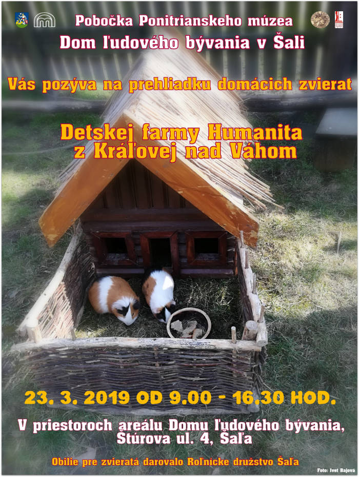 Prehliadka domácich zvierat Detskej farmy Humanita z Kráľovej nad Váhom sa uskutoční 23.3.2019 (sobota) od 9.00 – 16.30 hod. v priestoroch areálu Domu ľudového bývania v Šali, Štúrova ul. 4. Najmenší návštevníci majú jedinečnú možnosť spoznať a stretnúť sa s domácimi zvieratami, ktoré už v dnešnej dobe vidia často len v knižkách, televízii, či počítači.